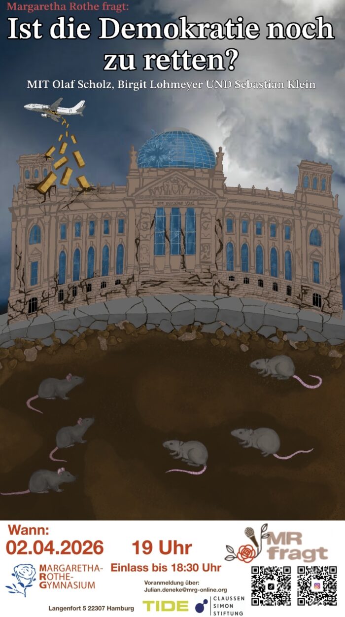 „Margaretha Rothe fragt…“ ist die führende politische Diskussionsveranstaltung an Hamburger Schulen. Seit 2014 fragen Schüler*innen des Margaretha-Rothe-Gymnasiums Menschen zu allem, was gerade politisch, gesellschaftlich oder wirtschaftlich wichtig ist. In den vergangenen Jahren durften wir namhafte Gäste wie Robert Habeck, Luisa Neubauer, Gregor Gysi, Charlotte Knobloch, Kevin Kühnert und Peter Tschentscher begrüßen. Wir kooperieren mit dem Bürgerkanal TIDE.tv und werden gefördert von der Claussen-Simon-Stiftung.